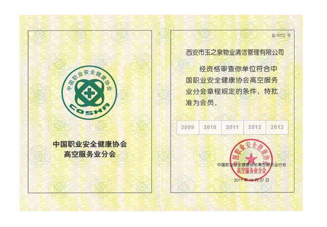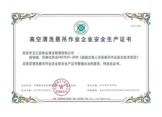 2012年我公司經(jīng)資格審核成為中國職業(yè)安全健康協(xié)會高空服務(wù)業(yè)分會的會員。,特發(fā)了高空清洗懸吊作業(yè)企業(yè)安全生產(chǎn)證書。