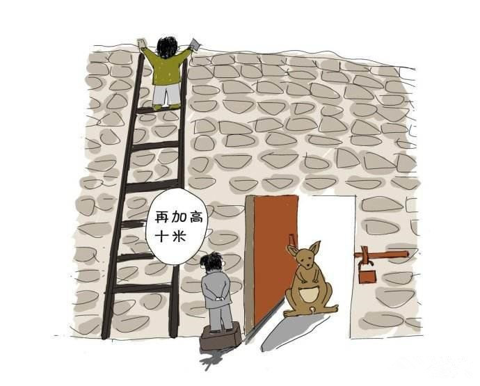 一天,動(dòng)物園管理員發(fā)現(xiàn)袋鼠從籠子里跑出來(lái)了,于是開(kāi)會(huì)討論,一致認(rèn)為是籠子的高度過(guò)低導(dǎo)致的。所以他們決定將籠子的高度由原來(lái)的10米加高到20米。結(jié)果第二天他們發(fā)現(xiàn)袋鼠還是跑到外面來(lái),所以他們又決定再將高度加高到30米。沒(méi)想到隔天居然又看到袋鼠跑到外面,于是管理員們大為緊張,決定一不做二不休,將籠子的高度加高到100米。